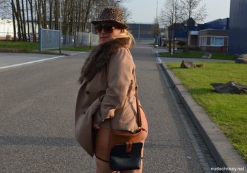 Busty Nude Chrissy goes for a naturist walk wearing only a fur coat