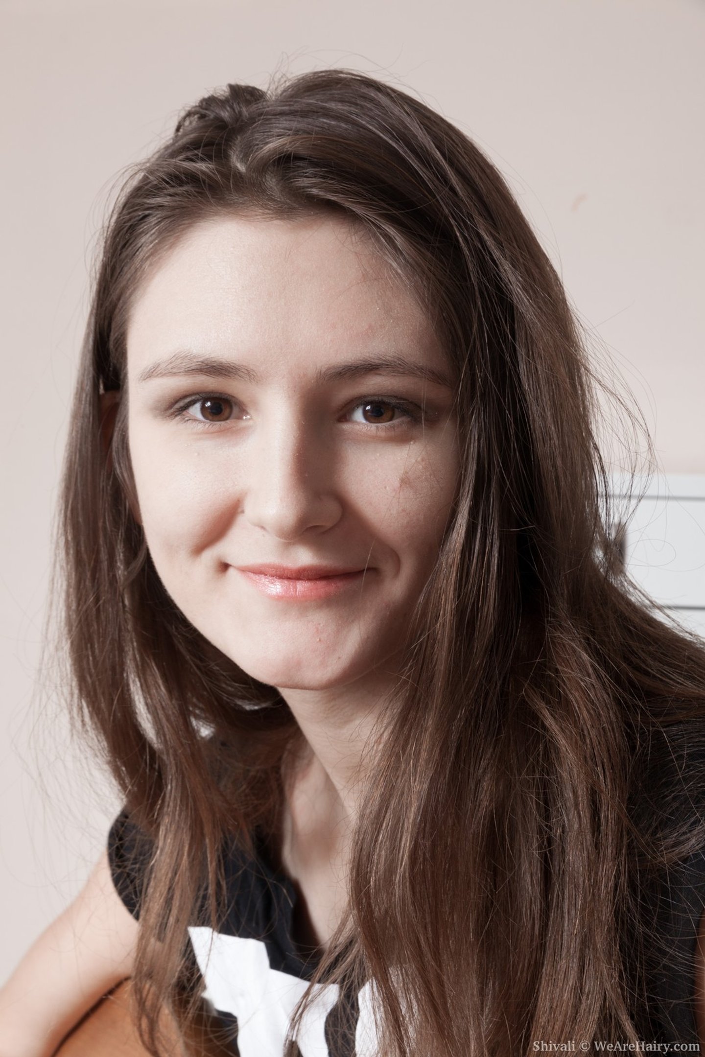 Provocative hairy chick Big Eyes taking everything off for the camera