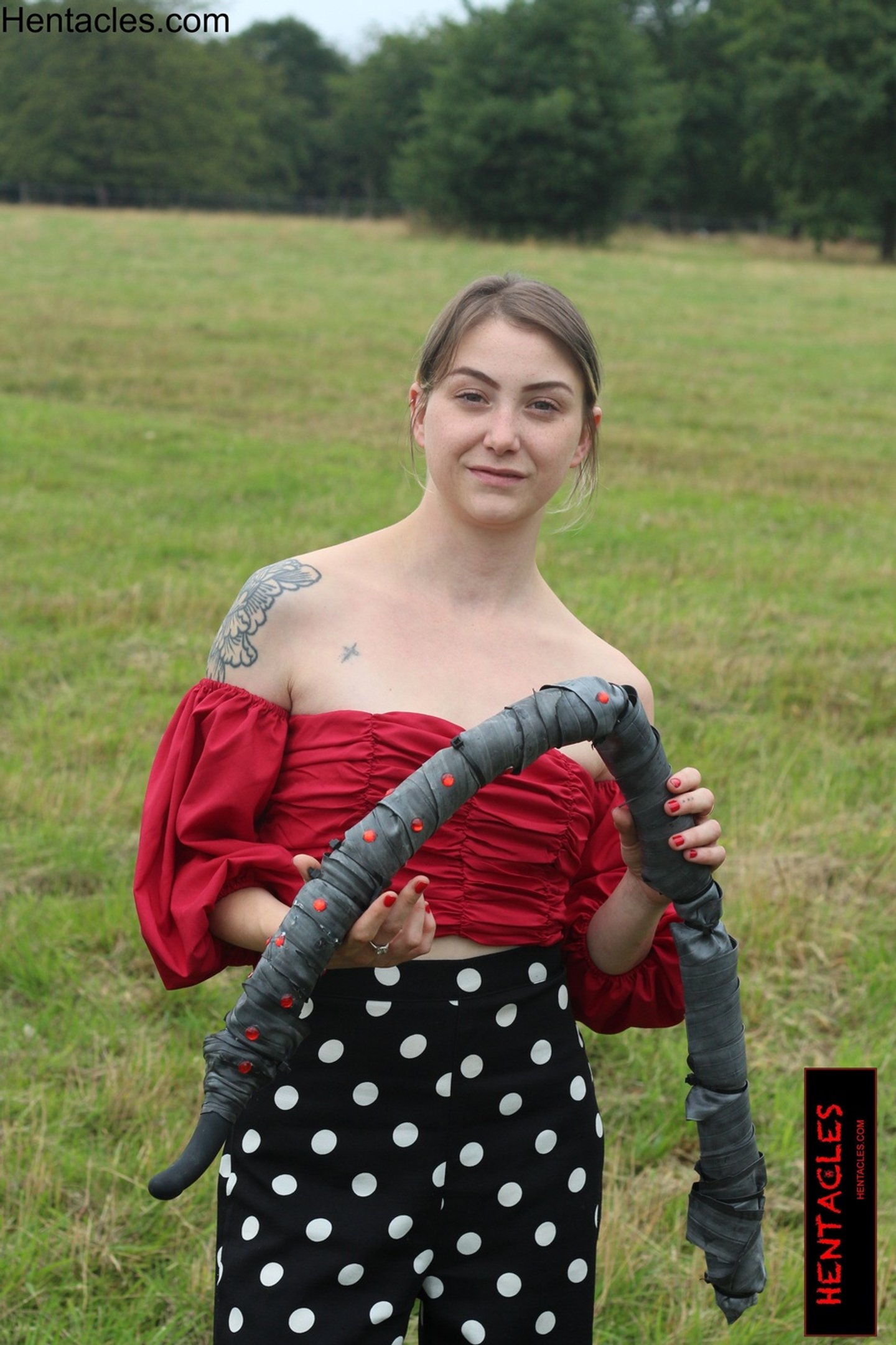 Cute clothed babe poses outdoors with a big tentacle sex toy
