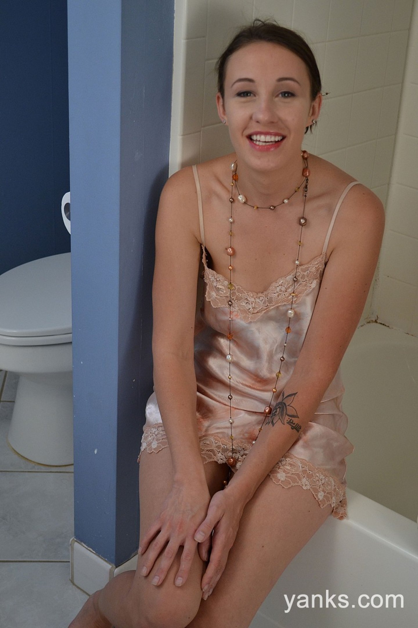 Blonde amateur Anna Delos posing in pink lingerie and masturbating